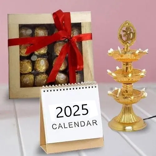 Amaze your loved ones by gifting them this Enticing Ferrero Rocher Chocos in a Wooden Box with Assortments and make them crave for more. This item comprises of 16 pcs Ferrero Rocher in a Wooden Gift Box along with 3 Tier LED Lamp, Desk Calender.