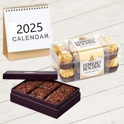 Deliver happiness by gifting this Lip-Smacking Combo of Brownies N Ferrero Rocher Chocos to your relatives and friends and wish merry New Year along with it. This Combo consists of- 1. Brownies (4 pcs) 2. 16 pcs Ferrero Rocher 3. Desk Calender
