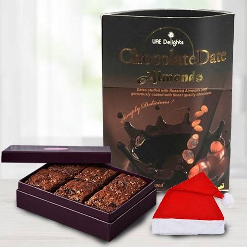 Deliver happiness on this Christmas into the lives of the special people by sending this Remarkable Chocos Pack with Brownie N Santa Claus Cap and create a magical world full of love for them. This item comes with Date, Almonds Chocolates pack (140 gm), 6 pcs Brownie and a Santa Claus Cap.