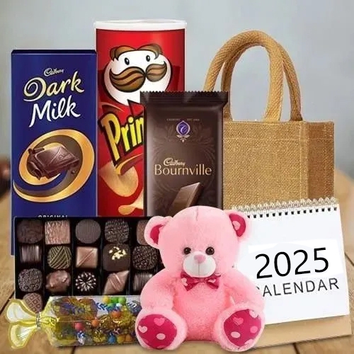 Deliver this amazing gift of Luscious Chocolates Gift Hamper to deliver happiness into the lives of the people you love on New Year. This Hamper contains- a) Pringle Chips (110 gms) b) 100 gm Homemade Chocolate c) 100 gms Homemade Toffee Chocolates d) Cadbury Bournville (80 gms) e) Cadbury Temptation Rum & Raisin (72 gm) f) 4 Pcs Ferrero Rocher g) 6 inch Teddy h) Desk Calender i) Gift Bag (Jute/Tote Bag)