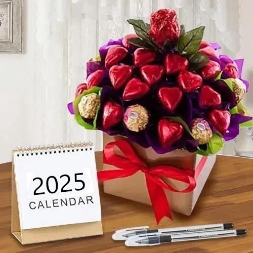 Deliver your message to your loved ones with this gift of Exclusive Arrangement of 22 pcs Heart Shaped Handmade N 8pcs Ferrero Rocher Chocolates with 2pcs Ball Point Pen, Desk Calender and make them feel special.