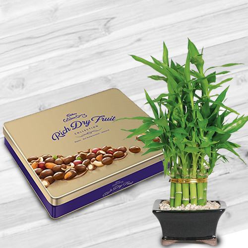 Let your loved ones cherish the moment with this Exquisite Gift of 2 Tier Lucky Bamboo Plant with Cadbury Rich Dry Fruit Tin (175g) created with the essence of your love for them.