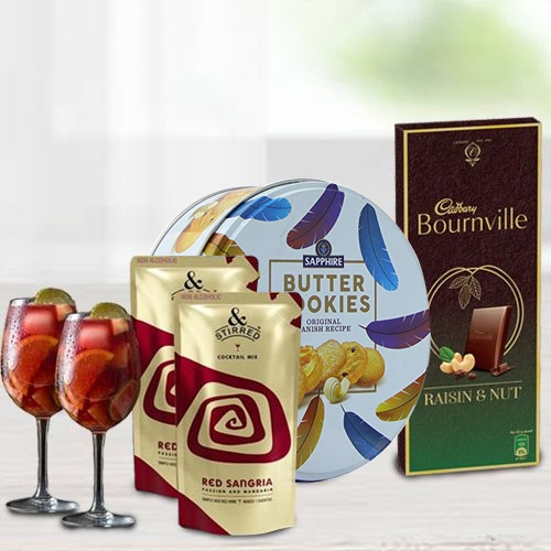 Bring joyful moments into the lives of your dearest ones with this Delicious N Stirred Red Sangria Cocktail (Non Alcoholic, 2pcs) with 2 pcs Wine Glasses, Kravour Butter Cookies (120g) & Cadbury Bournville Fruit n Nut Chocolate Bar (80g) and let them cherish it for lifetime.