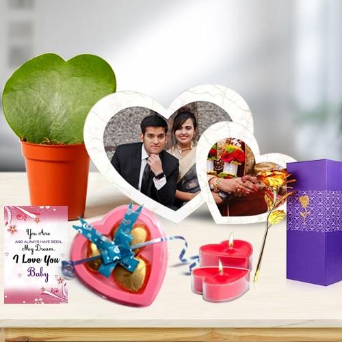 Express your innermost feelings with this lovely romantic gift of Exquisite Valentines Day Gift Selection and let your loved ones feel special on this very special day. This Gift Selection for V-day include: - Twin Heart Personalized Photo Frame, - Sweetheart Plant having Heart Shaped Leaf, - 3 pcs Heart Shape Handmade Chocolate, - Golden Rose, - I Love You Message Card and - 2 pcs Heart Shape Candle. Please send a High Resolution Photo or Your Personalized Message that needs to be added to the product at [email protected] along with you�re Alphanumeric Order Number.