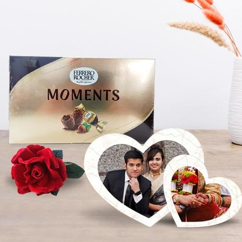 Make your Valentines Day more memorable with this lovely gift of Delectable 16 pcs Ferrero Rocher Moment Chocolates N Twin Heart Personalized Photo Frame with Red Velvet Rose Gift Combo and curve your name on the hearts of your loving Hubby. Please send a High Resolution Photo or Your Personalized Message that needs to be added to the product at [email protected] along with you�re Alphanumeric Order Number.