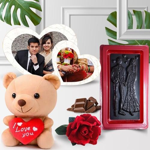 Delight your loving Wife on Valentines Day with this Eye-Catching Gift of Twin Heart Personalized Photo Frame, 6 in I Love You Teddy n Valentine Special Chocolate conveying the message of your heart. A Red Velvet Rose is also added to give a romantic feel. Please send a High Resolution Photo or Your Personalized Message that needs to be added to the product at [email protected] along with you�re Alphanumeric Order Number.
