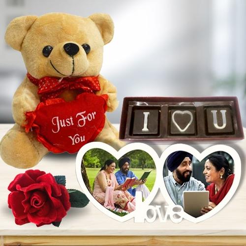 Let your loved ones feel special on Valentines Day with this Magnificent Love You Personalized Photo Gift Combo and frame the lovely moment in their heart forever. This Valentines Day Gift Combo include- - Dual Heart Love Personalized Photo Frame, - ILU Handmade 3 pcs Chocolate, - Just For You Message Teddy (6in) and - Red Velvet Rose. Please send a High Resolution Photo or Your Personalized Message that needs to be added to the product at [email protected] along with you�re Alphanumeric Order Number.