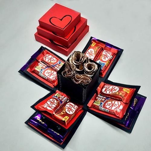 Adore your love on Valentines Day with this tempting gift of Admirable Valentine Special Explosion Box of Chocolates n Roses. This is a 3 Layer Explosion Box with 8 pcs Cadbury Dairy Milk Chocolates (13g each), 8 pcs Nestle Kitkat (10g each) n 4 Beautiful Roses and beautify the sentiments of this occasion.