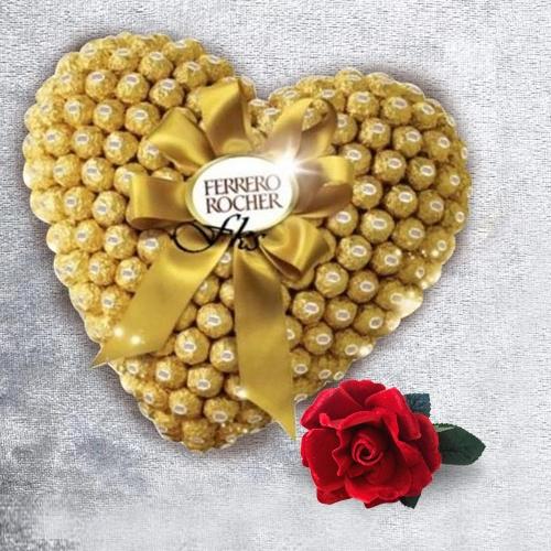 Conquer the hearts of your dear ones on this Valentines Week with this Charismatic Chocolate Day Gift of Heart Shaped Arrangement of 48 pc Ferrero Rocher Chocolates with Golden Bow teamed with Red Velvet Rose and see the joy it brings to their life.