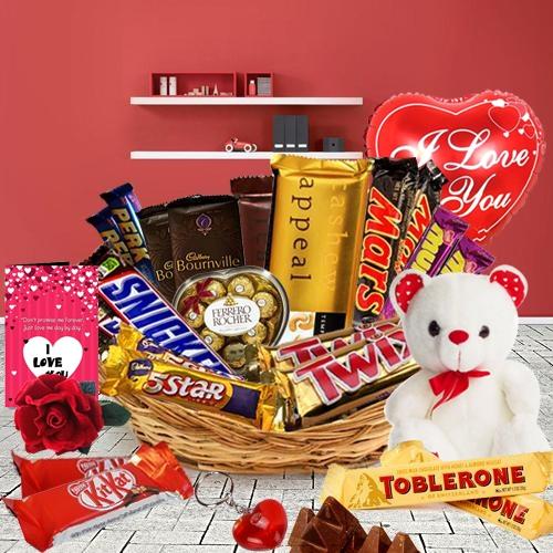Make your dear ones very happy and delighted on Valentines Day with this Exceptional Gift Basket of Assorted Chocolates with V-Day Essentials containing your love for them. This Valentine Special Gift Basket include: 1) 2 pc Cadbury 5 Star Chocolates, 2) 2 pc Twix, 3) 2 pc Snickers, 4) 2 pc Mars, 5) 2 pc Toblerone, 6) 2 pc Temptation, 7) 8 pc Ferrero Rocher Chocolates, 8) 2 pc Nestle Munch, 9) 2 pc Nestle Kitkat, 10) 2 pc Cadbury Perk, 11) 2 pc Cadbury Bournville, 12) Red Velvet Rose, 13) 6in Teddy, 14) Heart Shape Key Ring, 15) I Love You Card and 16) I Love You Mylar Balloon (1 pc).