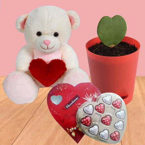 Enjoy the spirit of Valentines Day with this gift of Attractive Teddy Day Hearty Gift Trio and make your Valentine more joyful and happy. This Gift trio is presented with Teddy with a Heart, Sweet Heart Plant and 11 pcs Heart Shape Chocolate.