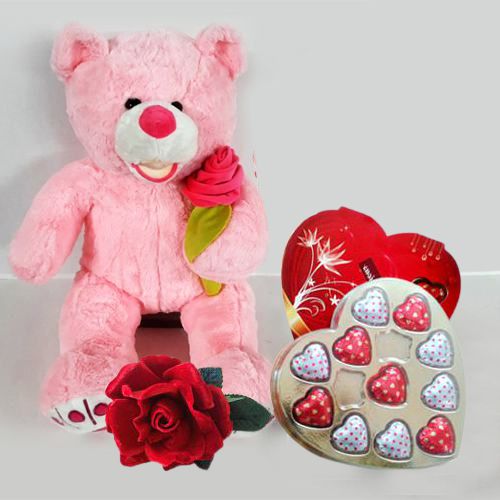 Enjoy the spirit of Valentines Week with this Charismatic Teddy Day Gift of Big Teddy with a Rose (40 cm) with 11 pcs Heart Shape Chocolate n Red Velvet Rose and make your Valentine more joyful and happy.