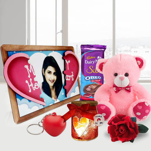 Bring smiles on the faces of your girlfriend with this birthday gift of Delightful Magnetic Heart with Handmade Chocolates n Candles and make your bond stronger. This combo gift features: 1. Personalized Magnetic Heart 2. Cadbury Dairy Milk Red Velvet Chocolate (60 g) 3. 1 pc Handmade Heart LED Lighting Lamp 4. 1 Velvet Rose 5. Heart Shape Key Ring 6. Cute Small Teddy (6 inches)
