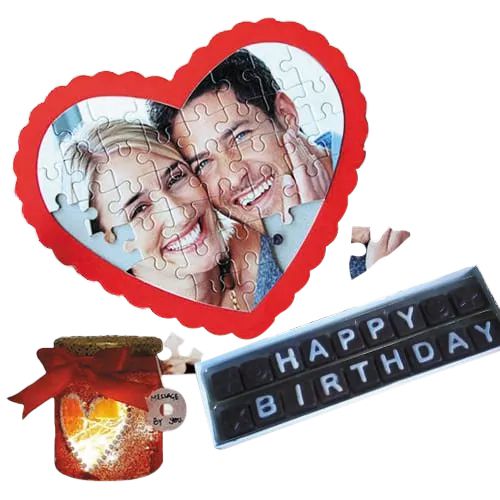 Make occasions grander with this Wonderful Personalized Heart Puzzle, Handmade Chocolate N LED Lamp and share the moment with your loved ones. This Birthday hamper contains Personalized Heart Shape Puzzle with Happy Birthday Message Handmade Chocolate n 1 LED Lamp.
