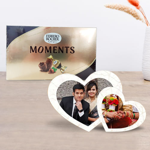 Delight your parents on their Anniversary with this Exclusive Twin Heart Personalized Photo Frame with Ferrero Rocher and make them realize how special they mean to you. This combo comes with Twin Heart Personalized Photo Frame and 16 pcs Ferrero Rocher Moment Chocolates.