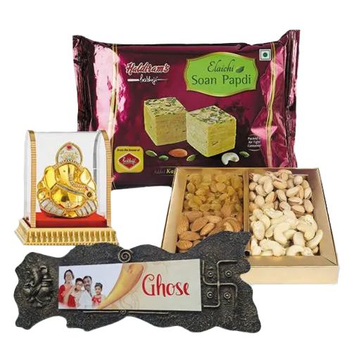 This gift combo contains: � Hand Made Name Plate (18 x 8.5 cm) � Assorted Dry Fruits Gift Box (200g) � Haldiram Soan Papdi (200g) � Vighnesh Ganesh Idol