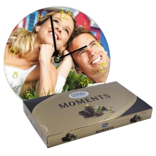 This gift set has: � Personalized Photo Glass Round Wall Clock � 16 pcs Ferrero Rocher Moments � Snickers (50g) � Twix (50g) � Mars (50g)