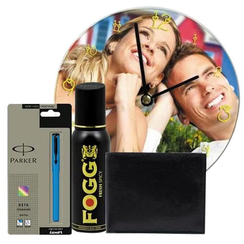 This gift set has: � A Personalized Photo Glass Round Wall Clock � Black Colour Leather Wallet � Parker Beta Pen � Fogg Deo