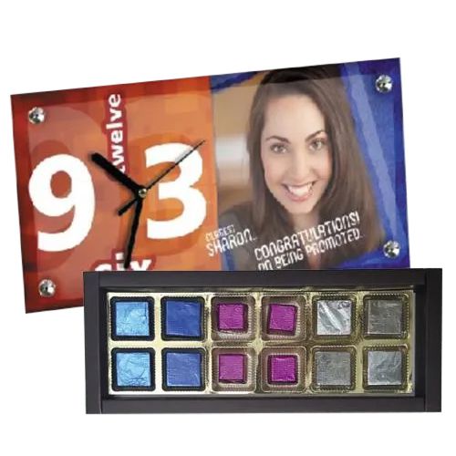 This gift set has: � A Personalized Photo Glass Table Clock (Rectangular) � 12 pcs Premium Handmade Chocolates filled with Strawberry, Kiwi n Cranberry