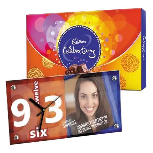 This gift set has: � Personalized Photo Glass Table Clock (Rectangular) � Cadbury Celebration Pack (126 g)