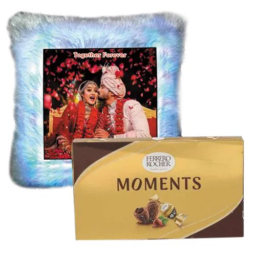 This gift set has: � A Personalised LED Square Fur Cushion � 16 pcs Ferrero Rocher Moments Chocolate