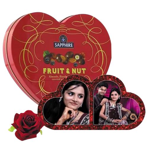 Create magical moments by ordering online this Striking Hearty Delight Personalized Gift Combo for your loved ones on their Birthday and spread your warm feelings into their hearts. This B-day gift combo consists of Personalised HB Double Heart with a Red Heart Shape Fruit N Nut Tin Box (160 g) a Velvet Rose.