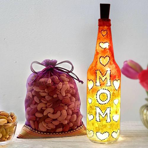 Send this Special Gift of Handcrafted LED Lighting Dot Mandala Art Decorated "MOM" Bottle Lamp N Assorted Dry Fruits Potli (200g) for Mothers Day and with your Mummy with all the happiness N health in this world.