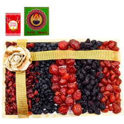 Celebrate Diwali with your loved ones. Gift them this Deepavali Gift of Assorted Dry Fruits with Puja Thali N Diya and make them feel your presence on this festive day. This Deepavali Gift Set contains: 1. Cashew (200 g) 2. Almonds (200 g) 3. Raisin (200 g) 4. Pistachio (200 g) 5. Golden Plated Thali (Size 5-6 inch) 6. 4 Pcs Terracotta Mud Diya 7. Free Laxmi Ganesh Silver Plated Coin.