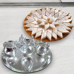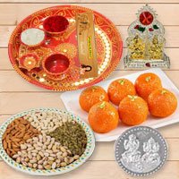 Deepawali moments turned out to be very special by ordering this Cherished Gift of Puja Thali, Dry Fruits, Chocolates N More and make others feel happy. This Diwali Hamper consists of 1. Silver Plated Paan Shaped Pooja Thali 2. Cashew (100 gm) 3. Almond (100 gm) 4. 4pc Ferrero Rocher Chocolate 5. Vighnesh Ganesh Idol 6. Cadbury Dairy Milk Celebration (50g) 7. 5pc Matka Wax Diya 8. A Decorative Reusable Gift Box.