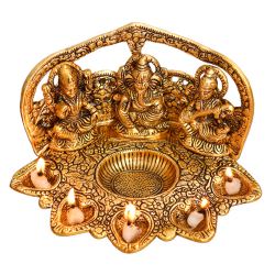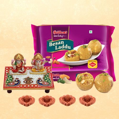 Let others feel special as you send online this Pious Gift of Mata Laxmi Ganesh Marble Chowki N Haldiram Sweets on special Diwali celebrations. This Deepavali gift contains Shanky N Shiney Laxmi Ganesh Idol with Marble Choki (Peacock Color), 4 pcs Teracota Mud Diya n 6 pc Haldiram Besan Laddu.