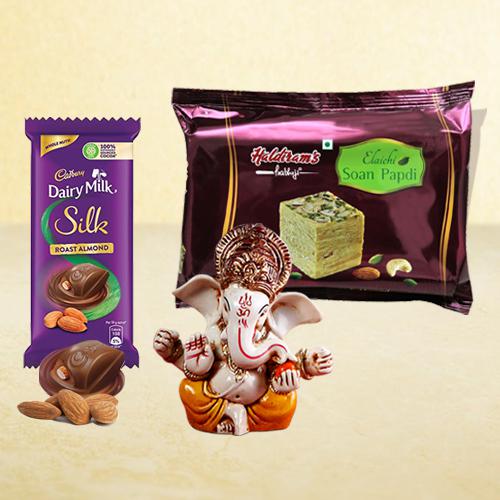 Have a Joyful Diwali with Sweetness of Mithai, Chocolates N Ganesh Idol to deliver happiness into the lives of the people you love. This Deepavali gift contains Polyresin Ganesh Idol, Haldiram Soan Papdi (200 gm) n Cadbury Dairy Milk Silk Roast Almond Chocolate Bar (58 g).