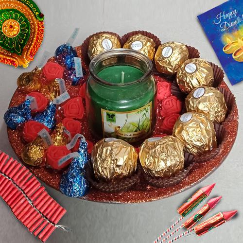 This festive season, send a gift combo of Gift Platter of Imported Ferrero Rocher n Herseys Chocolates n Aroma Candle for Diwali Festivity for your family n friends and make them feel happy. This gift combo has - 1) 8pcs Ferrero Rocher Chocolates 2) Hersheys Kisses Chocolates (Cookie n Cream, 33g) 3) Hersheys Kisses Chocolates (Milk Almonds, 33g) 4) Aroma Jar Candle from Iris 5) Decorated with Art Flowers on Stainless Steel Thali