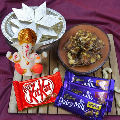 Create special moments for your loved ones with this Classy Marble Ganpati with Assorted Chocolates n Haldiram Sweets when you are together with your loved ones. This gift hamper contains: 1. Jaipuri Craft Marble Ganpati Idol (2.3 X 2.3") Multicolour 2. Nestle Kit Kat 3. Cadbury Dairy Milk Crackle Chocolate Bar (36g) 4. Cadbury Dairy Milk Fruit and Nut Chocolate Bar (38g) 5. Cadbury Dairy Milk Roast Almond Chocolate Bar (38g) 6. Haldiram Kaju Barfi (200g) 7. Haldiram Khajur Barfi (Airtight Box) (200g) 2. Nestle Kit Kat 3. Cadbury Dairy Milk Crackle Chocolate Bar (36g) 4. Cadbury Dairy Milk Fruit and Nut Chocolate Bar (38g) 5. Cadbury Dairy Milk Roast Almond Chocolate Bar (38g) 6. Haldiram Kaju Barfi (200g) 7. Haldiram Khajur Barfi (Airtight Box) (200g) ">
