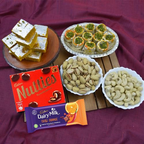 Celebrate with your loved ones as you send online this Stunning Gift of Gift of Haldiram Sweets, Cadbury Chocolates n Dry Fruits and increase happiness in their lives. This gift hamper contains: 1. Haldiram Kaju Pista Flower - 250 gm 2. Kaju Bite - 200 gm 3. Cashew - 50 gm 4. Pistachio - 50 gm 5. Cadbury Dairy Milk Madbury Chilli Orange Chocolate Bar - 36 gm 6. Cadbury Nutties Chocolate - 30 gm