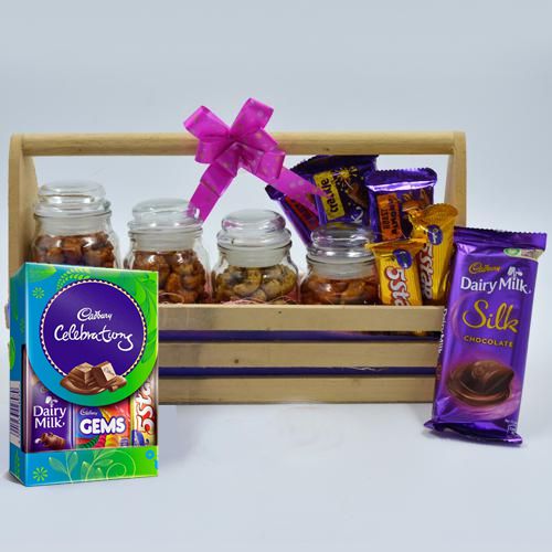 Deck the lives of the people closest to your heart with love by sending this Classy Combo of Flavored Cashews with Cadbury Chocolates that beautifully conveys the message of your heart to them. This gift hamper contains: 1. Cheese Cashew in Small Jar (50 gm) 2. Peryperry Cashew in Small Jar (50 gm) 3. Pizza Cashew in Small Jar (50 gm) 4. Barbecue Cashew in Small Jar (50 gm) 5. Cadbury Celebrations Assorted Chocolate Pack (70.2 gm) 6. Cadbury Dairy Milk Silk Hazelnut (58 gm) 7. Cadbury Dairy Milk Crackle Chocolate Bar (36 gm) 8. Cadbury Dairy Milk Fruit and Nut Chocolate Bar (38 gm) 9. Cadbury Dairy Milk Roast Almond Chocolate Bar (38 gm ) 10. Cadbury 5 Star Chocolate Bar (40 gm *2) 11. A Wooden Tray for 4 Jars.