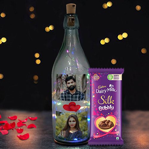 Lock up your heart with that of your beloved by sending this Personalized Multi Color LED Glowing Bottle Lamp and Cadbury Dairy Milk Silk Bubbly Chocolate Bar (120g) Gift Combo and dapple them with happiness on Valentines Day.