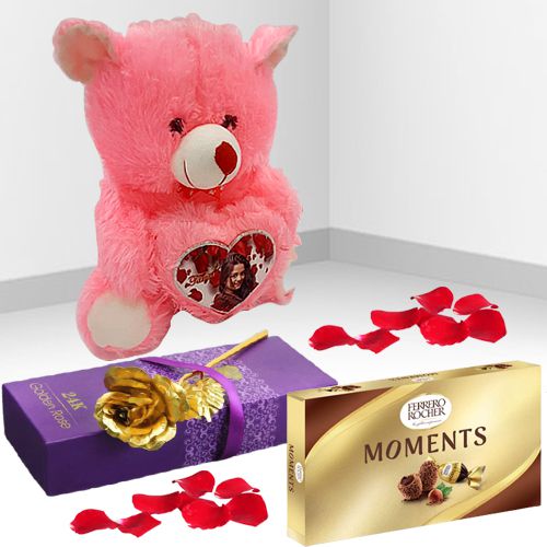 Present to him/her on Valentines Day, this gift of Personalized Heart Handle 12 inch Teddy which comes elegantly paired with a Golden Rose (6 inch) n a Box of 16pc Ferrero Rocher Moments (69.6g each) to make their dreams come true.