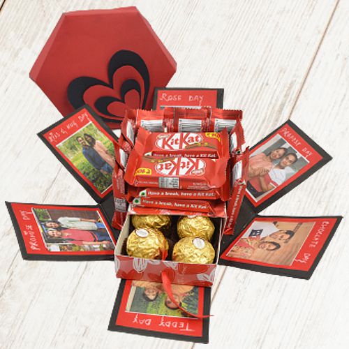 Win the hearts of your dear ones with this Romantic Hexagonal Explosion Box of 4pc Ferrero Rocher N 15pc Nestle Kitkat (12g each) to express your hearty love on this Valentines Day. This romantic hexagonal explosion box has option to add 6 Personalized Photo/Messages.