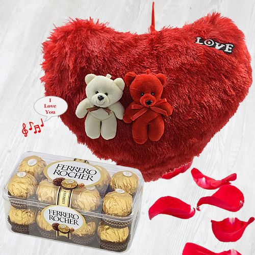 Convey your message of love in the best possible way with this gift of Musical Heart Shape Cushion with T16 Ferrero Rocher Chocolates Box to fill the life of your loved ones with happiness on Valentines Day. This musical cushion plays I Love You Tune when pressed.