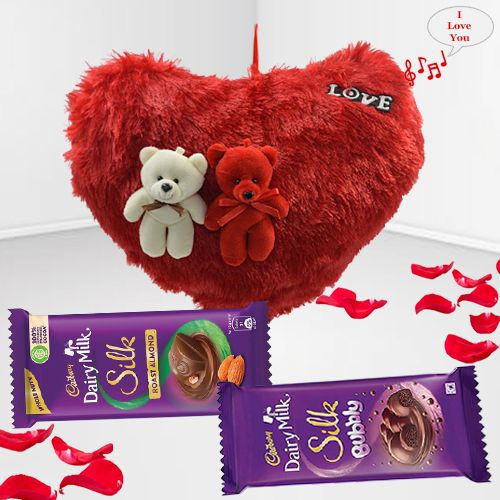 Confess your inner thoughts on Valentines Day with this gift of ILU Singing Heart Shape Cushion with Cadbury Dairy Milk Silk Roast Almond Chocolate Bar (143g) and Cadbury Dairy Milk Silk Bubbly Chocolate Bar (120g) that will reflect the core of your heart to your favorite people. This musical cushion plays I Love You Tune when pressed.