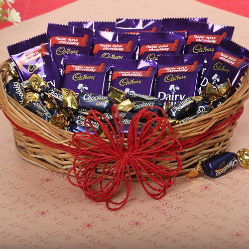 Immerse your dear ones in the ocean of love by sending them this Choco Treat Basket for Valentine and make him/her feel at the top of the world. This chocolate assortment comes along with 12 pcs Cadbury Dairy Milk Chocolate Bar (13.2g) and 30 pcs Cadbury Chocolairs Gold Candy which is decorated in a cane basket.