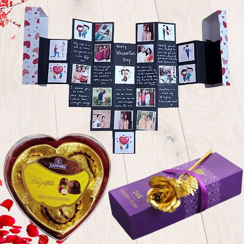 This valentine combo is a fusion of a Pop Out Heart Personalized Photo N Message Card with 3 pcs Heart Shape Sapphire Hazelfills Chocolate Box N a Golden Rose.