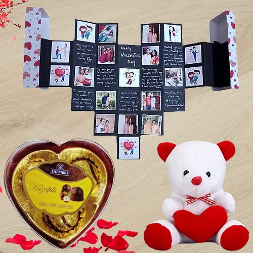 This valentine gift is a combo of a Pop Out Heart Personalized Photo n Message Card with 3 pcs Heart Shape Sapphire Hazelfills Chocolate Box N a 6in Teddy with Heart