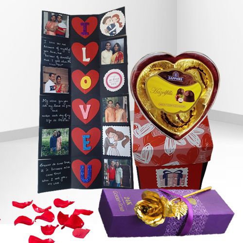 Adore your love on Valentines Day with this tempting gift of Charismatic Love Infinity Personalized Card with Heart Shape Sapphire Chocolate Box N a Golden Rose and beautify the sentiments of this occasion. This gift is a combination of a Love Infinity Personalized Explosion Card handmade with 5 Digital Photos N 3 Customized Messages and clubbed with a 3pcs Heart Shape Sapphire Hazelfills Chocolate Box N a Golden Rose.
