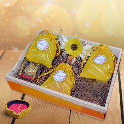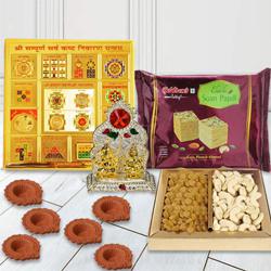 Make your dear ones drool in happiness by sending this gift of Chocolicious n Nutty Diwali Wishing Hamper for festive celebrations. This Diwali Gift Hamper include: 1. A Designer Pearl Decorated Square Tray Consists of Cashews, Raisins, Almonds, Pistachios (500g Gross Wt) and 8 pc Sapphire Hazellfill Chocolate 2. Cadbury Dairy Milk Silk (60 gm) 3. Cadbury Dairy Milk (52 gm) 4. Snickers Chocolate (25 gm) 5. A Ganesh Laxmi Mandap 6. A Happy Diwali Fridge Magnet (Handmade, MDF Board, 3x3 in) 7. A Free Diwali Wishing Card