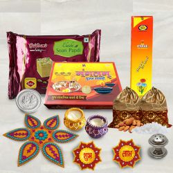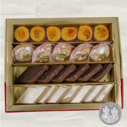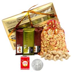 Make your dear n near ones drool with happiness on this festive day by delivering this unique Diwali Gift of Cadbury Cravings N Tea Lights Magic Hamper online. This Deepavali Gift Hamper holds: 1. 2pc Cadbury Crackle Chocolate Bar (36 gm each) 2. 2pc Cadbury Roast Almond Chocolate Bar (36 gm each) 3. 2pc Cadbury Fruit N Nut Chocolate Bar (36 gm each) 4. 2pc Cadbury Dairy Milk Chocolate Bar (36 gm each) 5. Free Silver Plated Ganesh Laxmi Coin 6. Lotus Tea Light Candle Holder 7. A Decorative Gift Basket