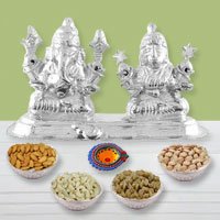 Treat your dearest one in an exclusive way as you send online this Spread The Festive Cheer Gift Hamper and make them feel very special. This Diwali Gift Hamper include: 1. A Reusable Square Wooden Tray holding Set of 2 Air Tight Glass Jar with Wood Finish Lid filled with Cashews, Raisins, Almonds, Pistachios (500g Gross Wt.) 2. 3pc Ferrero Rocher 3. A Designer Diya 4. A Shubh Labh Wall Sticker Set 5. A Silver Plated Coin 6. A Free Diwali Greetings Card