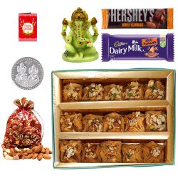 Wishes are delivered in the most stunning way by gifting this Diwali Season Gift Hamper for lovely people in a lovely way. This Diwali Gift pairing includes: 1. A Sweets Assortment Box that holds Kaju Katli (6pc), Soan Papdi (6pc), Kesaria Peda (6pc), Mawa Locket (6pc), Mini Samosa (100 gm) and Dalmoth Mewa (100 gm). 2. Cadbury Dairy Milk Roast Almond Chocolate Bar (36 gm) 3. Cadbury Dairy Milk Crackle Chocolate Bar (36 gm) 4. Cadbury Dairy Milk Fruit N Nut Chocolate Bar (36 gm) 5. Silver Plated Paan Shaped Pooja Thali 6. Silver Plated Ganesh Laxmi Coin 7. Kesaria Misri (20 gm) 8. Pooja Samagri 9. A Free Diwali Card