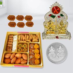 Feel great when you gift this All Time Classic Festive Gift Hamper and bring joy into the lives of the people you love. This Diwali Gift Hamper contains: 1. A Mixed Sweets n Snacks Box of Mawa Tikiya (6pc), Kesar Laddoo (4pc), Kaju Pan (5pc) and Bhujia Packet (MRP 10). 2. Cadbury Dairy Milk Roast Almond Chocolate Bar (36 gm) 3. Snickers Chocolate (25 gm) 4. Cadbury Nutties (30 gm) 5. 3 pc Tea Light Candles 6. Silver Plated Ganesh Laxmi Coin 7. A Free Diwali Card