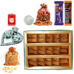 Merge your love with this Diwali Blessings Gift Hamper Delight and send it to your dearest ones. This Deepawali Gift Hamper features: 1. An assorted Sweets n Snacks Box of Kesar Laddoo (6 pc), Dilkhushal (4 pc), Mawa Tikiya (5 pc), Soan Papdi (5 pc) and Bhujia Packet (MRP 10). 2. Cadbury Dairy Milk Roast Almond Chocolate Bar (36 gm) 3. Hersheys Almond Chocolate Bar (40 gm) 4. Silver Plated Ganesh Laxmi Coin 5. Glowing Ganesh Idol 6. Crunchy Almond Potli (100 gm) 7. A Free Diwali Card